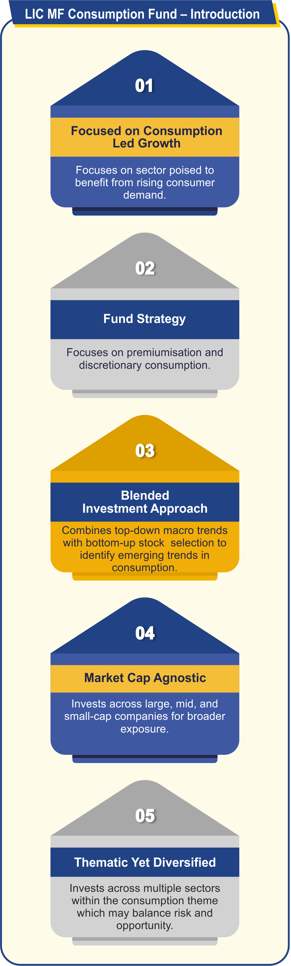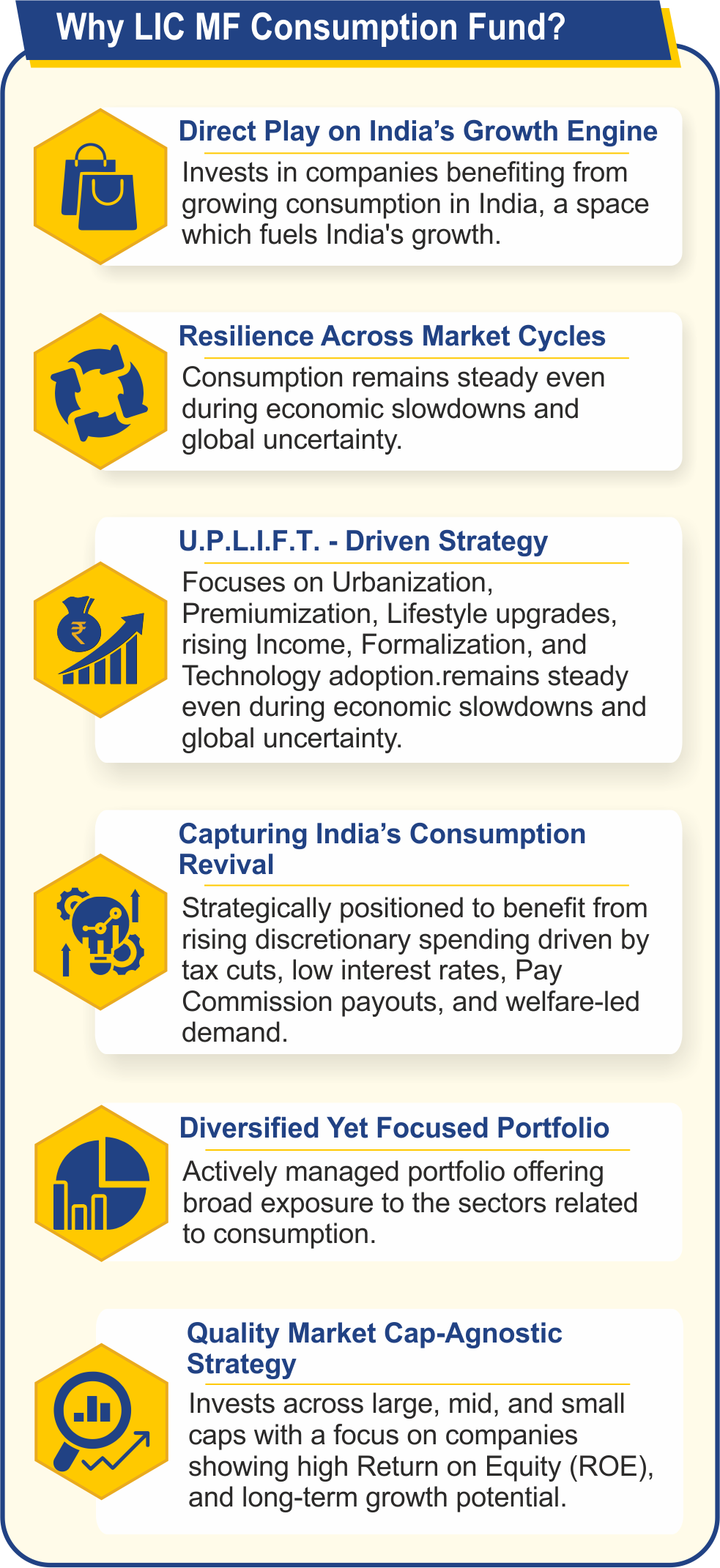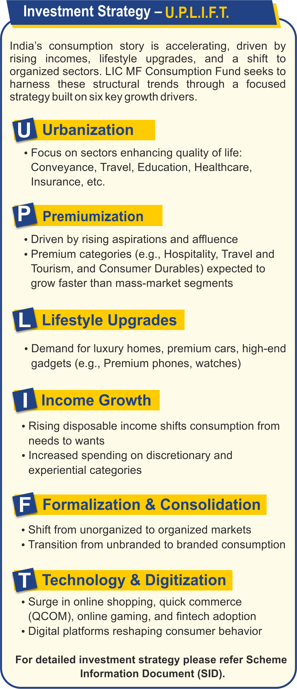 India’s consumption story is accelerating, driven by rising incomes, lifestyle upgrades, and a shift to organized sectors. LIC MF Consumption Fund seeks to harness these structural trends through a focused strategy built on six key growth drivers.