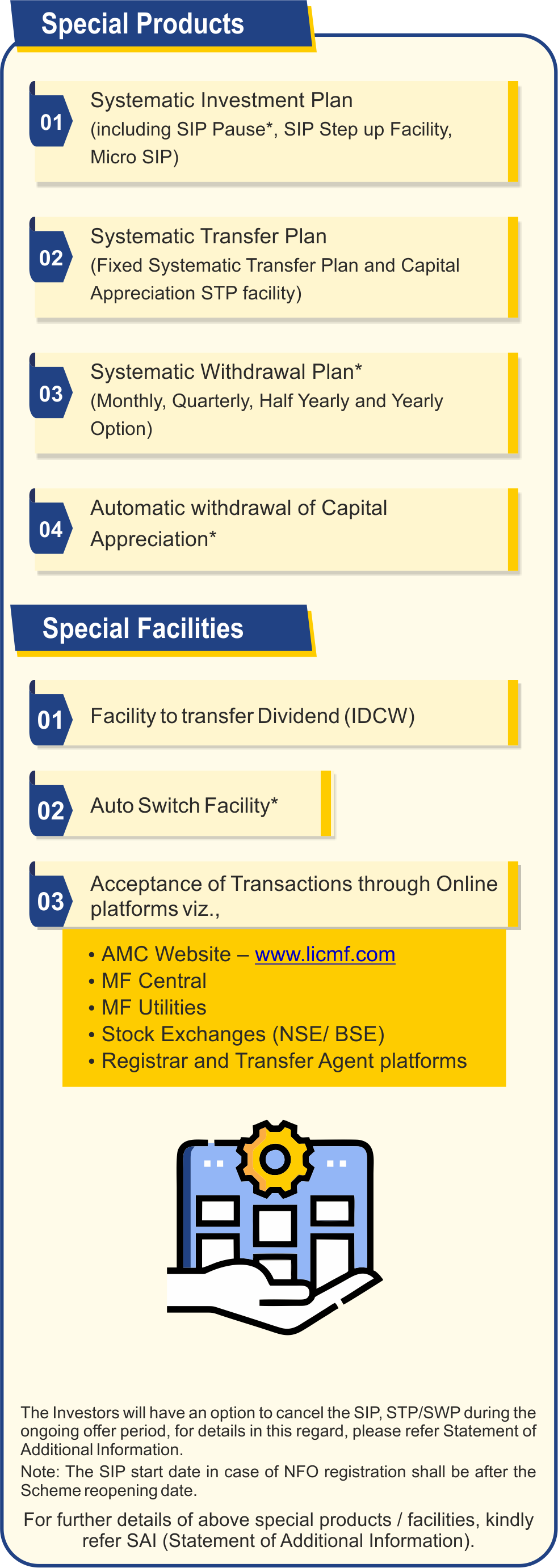 *Available only during New Fund Offer Period. | For further details of above special products / facilities, kindly refer SAI (Statement of Additional Information).